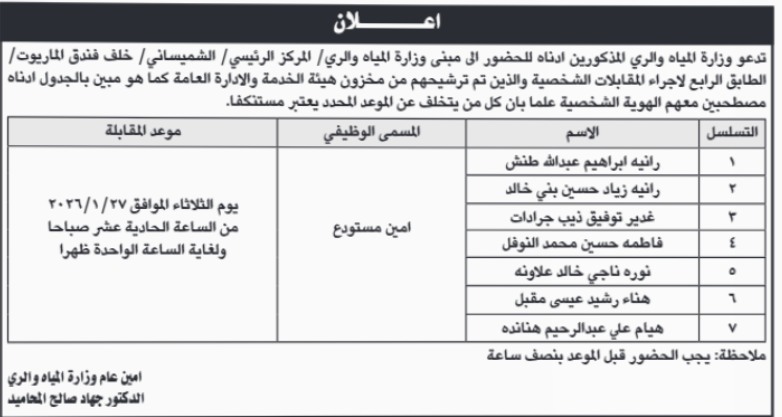 وزارة المياه تدعو مرشحين لاجراء المقابلات الشخصية..أسماء On يناير 21, 2026 Share 4٬756 المرفأ- تدعو وزارة المياه والري، اليوم الأربعاء، التالية أسماؤهم لاجراء المقابلات الشخصية. Share 4٬756