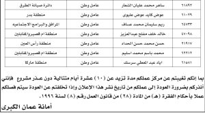 أنذرت أمانة عمان الكبرى اليوم الاحد الموظفين المذكورة أسماؤهم أدناه، المتغيبين عن مراكز عملهم مدة تزيد على عشرة أيام متتالية دون عذر مشروع، بضرورة العودة إلى عملهم تجنباً للفصل من العمل، عملا بأحكام قانون العمل”.