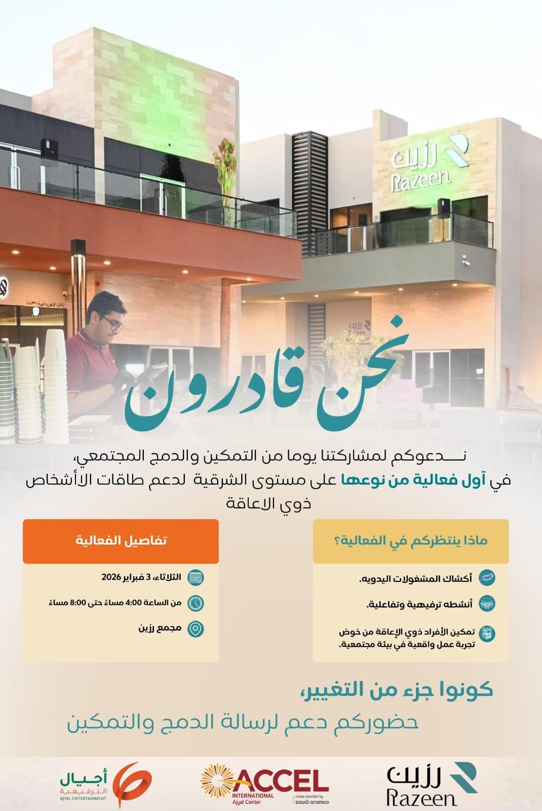 تنطلق يوم الثلاثاء 3 فبراير 2026 في *مجمع رزين الظهران* مبادرة «نحن قادرون – We Are Capable»، كأول مبادرة من نوعها على مستوى المنطقة الشرقية، تهدف إلى تمكين البالغين من ذوي الإعاقة عبر إتاحة فرص عمل واقعية داخل بيئة تسوق مفتوحة، بما يعزز مشاركتهم الفاعلة في المجتمع وسوق العمل.