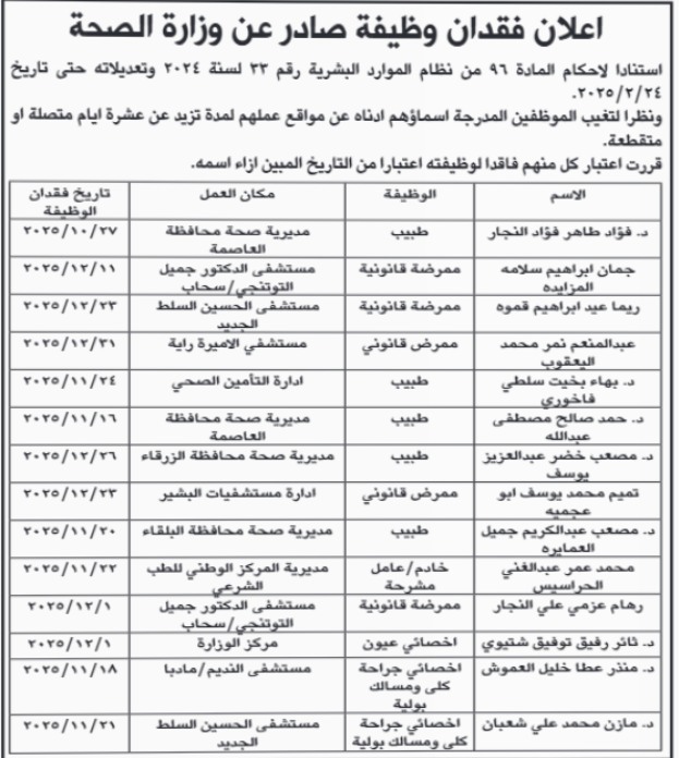 المرفأ- أعلنت وزارة الصحة عن فقدان عدد من موظفيها لوظائفهم، وفق أحكام المادة (96) من نظام إدارة الموارد البشرية رقم (33) لسنة 2024 وتعديلاته، حتى تاريخ 24 فبراير 2025.