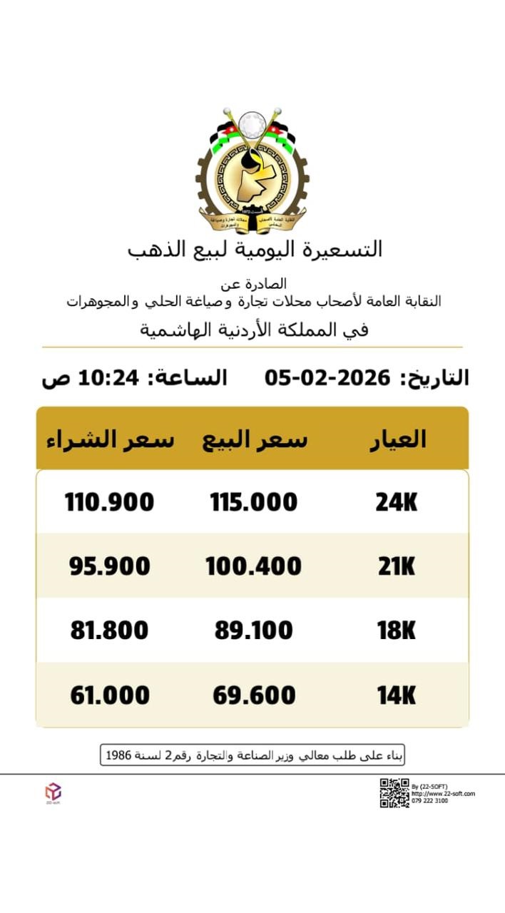 وأظهرت التسعيرة اليومية أن سعر بيع غرام الذهب عيار 21، الأكثر تداولًا وطلبًا بين المواطنين، وصل إلى 100.40 دينار، في حين بلغ سعر الشراء 95.90 دينار.