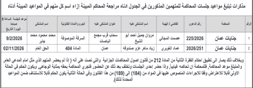 مذكرات تبليغ مواعيد جلسات محاكمة لأردنيين.أسماء