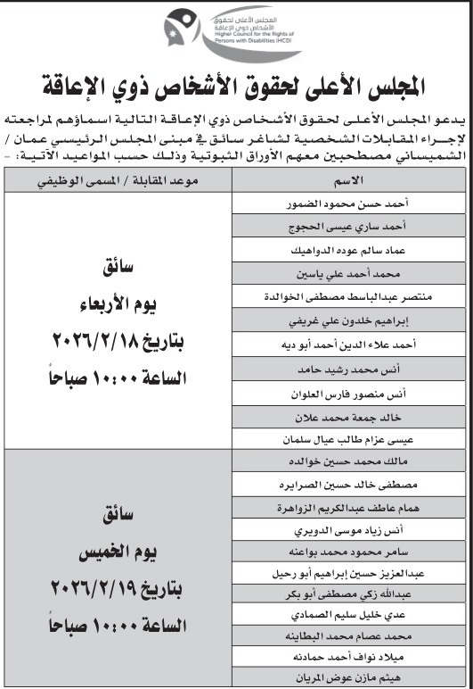 المجلس الأعلى لحقوق الأشخاص ذوي الإعاقة يدعو المرشحين التالية أسماؤهم لإجراء المقابلات الشخصية On فبراير 10, 2026 Share 4٬156 المرفأ- دعا المجلس الأعلى لحقوق الأشخاص ذوي الإعاقة اليوم الثلاثاء، التالية أسماؤهم لإجراء المقابلات الشخصية. Share 4٬156