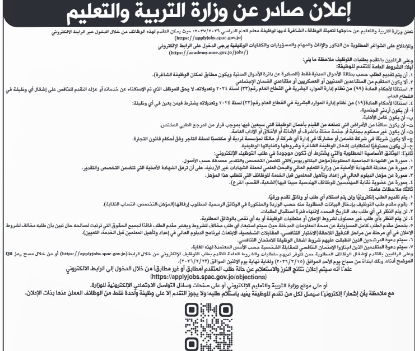 وزارة التربية تعلن عن توفر شواغر لوظيفة معلم On فبراير 10, 2026 Share 4٬885 المرفأ- أعلنت وزارة التربية والتعليم ، اليوم الثلاثاء، عن حاجتها لتعبئة وظائف شاغرة لوظيفة معلم . Share 4٬885