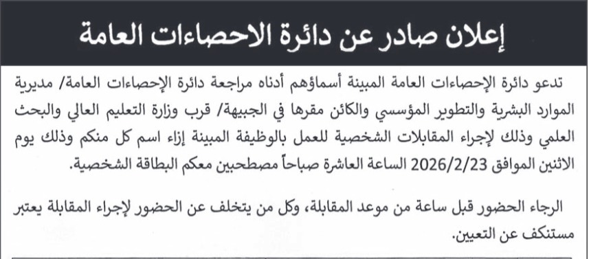 دائرة الإحصاءات العامة تدعو مرشحين لإجراء المقابلات الشخصية..أسماء On فبراير 16, 2026 Share 4٬161 المرفأ- تدعو دائرة اإحصاءات العامة اليوم الاثنين التالية اسماؤهم لاجراء المقابلات الشخصية. Share 4٬161