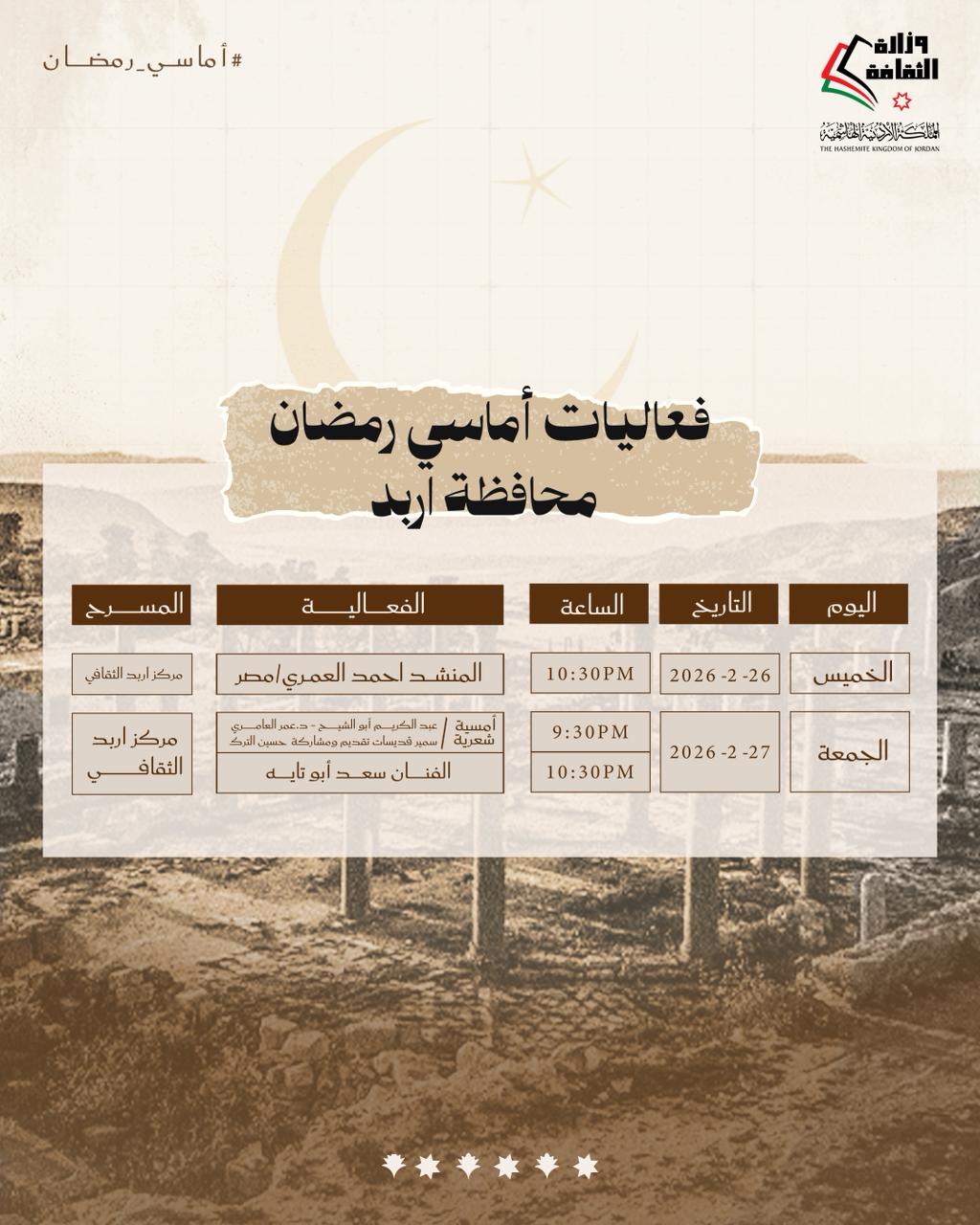 تواصل وزارة الثقافة تنفيذ برنامج «أماسي رمضان» من خلال حزمة فعاليات ثقافية وفنية تقام مساء الخميس والجمعة المقبلين، في عدد من محافظات المملكة، انسجامًا مع ما يحمله الشهر الفضيل من قيم روحية واجتماعية، وذلك في المراكز الثقافية بالمحافظات من الساعة التاسعة والنصف مساءً وحتى الثانية عشرة ليلًا.