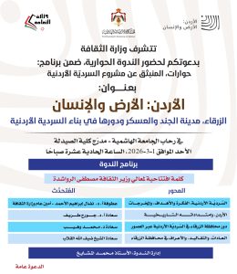 المرفأ- تعقد وزارة الثقافة ضمن برنامج حوارات المنبثق عن مشروع السردية الأردنية ندوة حوارية بعنوان “الأردن .. الأرض والإنسان.. الزرقاء مدينة الجند والعسكر ودورها في بناء السردية الأردنية” يوم الأحد المقبل في الجامعة الهاشمية، الساعة الحادية عشرة صباحا.