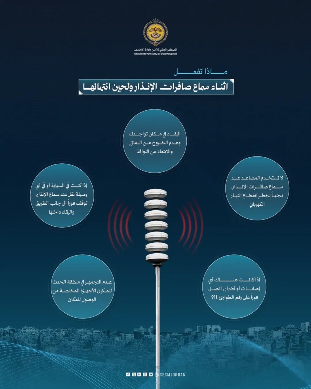 وأشار المركز إلى أنه عند سماع صافرات الإنذار داخل المنزل أو أي مبنى مغلق، يجب الابتعاد عن النوافذ، تجنب استخدام المصاعد، الاتصال فورًا برقم الطوارئ (911) عند حدوث إصابات أو أضرار، والحصول على المعلومات من المصادر الرسمية فقط، مع الحفاظ على الهدوء وتجنب الذعر.