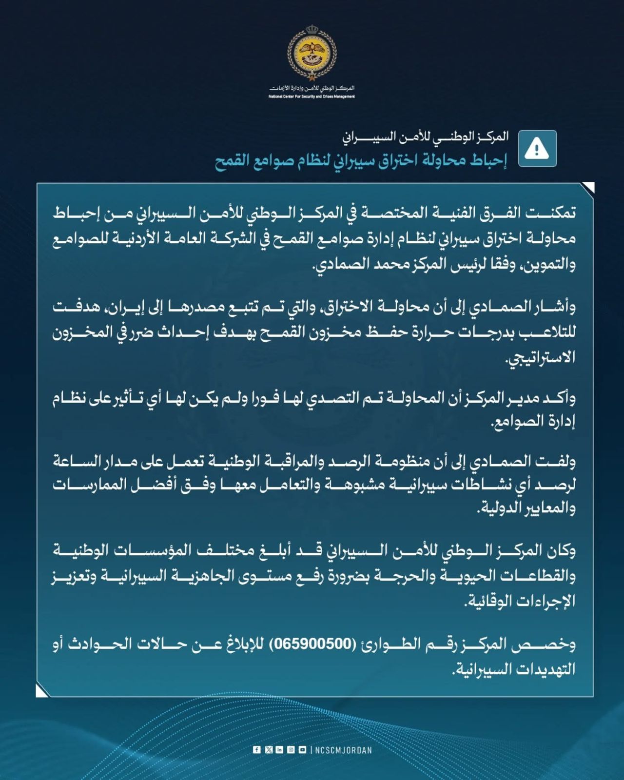 وأضاف الصمادي أن المركز يواصل تعزيز منظومات الرصد والاستجابة السيبرانية، بالتنسيق مع الجهات المعنية، لحماية البنى التحتية الحيوية والأمن الغذائي للمملكة من أي تهديدات رقمية محتملة.