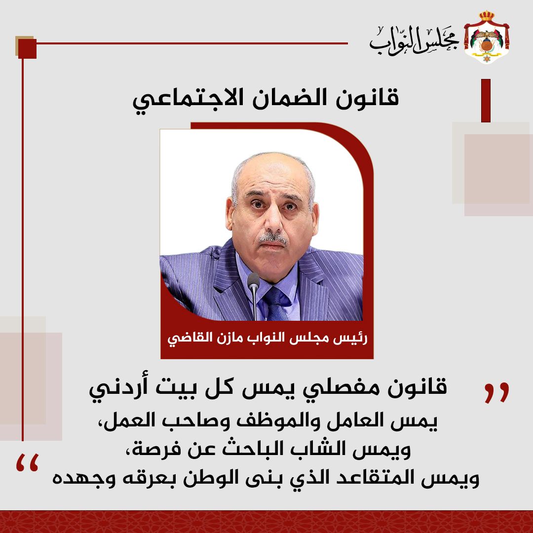 من هنا فانني اوكد لشعبنا الأردني العزيز ولكل المهتمين أن مجلس النواب يدرك أن قانون الضمان الاجتماعي ليس نصاً قانونياً مجرداً ، بل تشريع يرتبط بالأمن الاجتماعي والاستقرار الاقتصادي، ويؤثر بصورة مباشرة على مختلف شرائح المجتمع. ولذلك فإننا سنتعامل معه بأعلى درجات المسؤولية الوطنية والجدية، بعيداً عن أي استعجال أو انفعال، وسنضعه في عين الرعاية والدراسة المعمقة بكل موضوعية وبما يضمن تحقيق المصلحة الوطنية العليا.