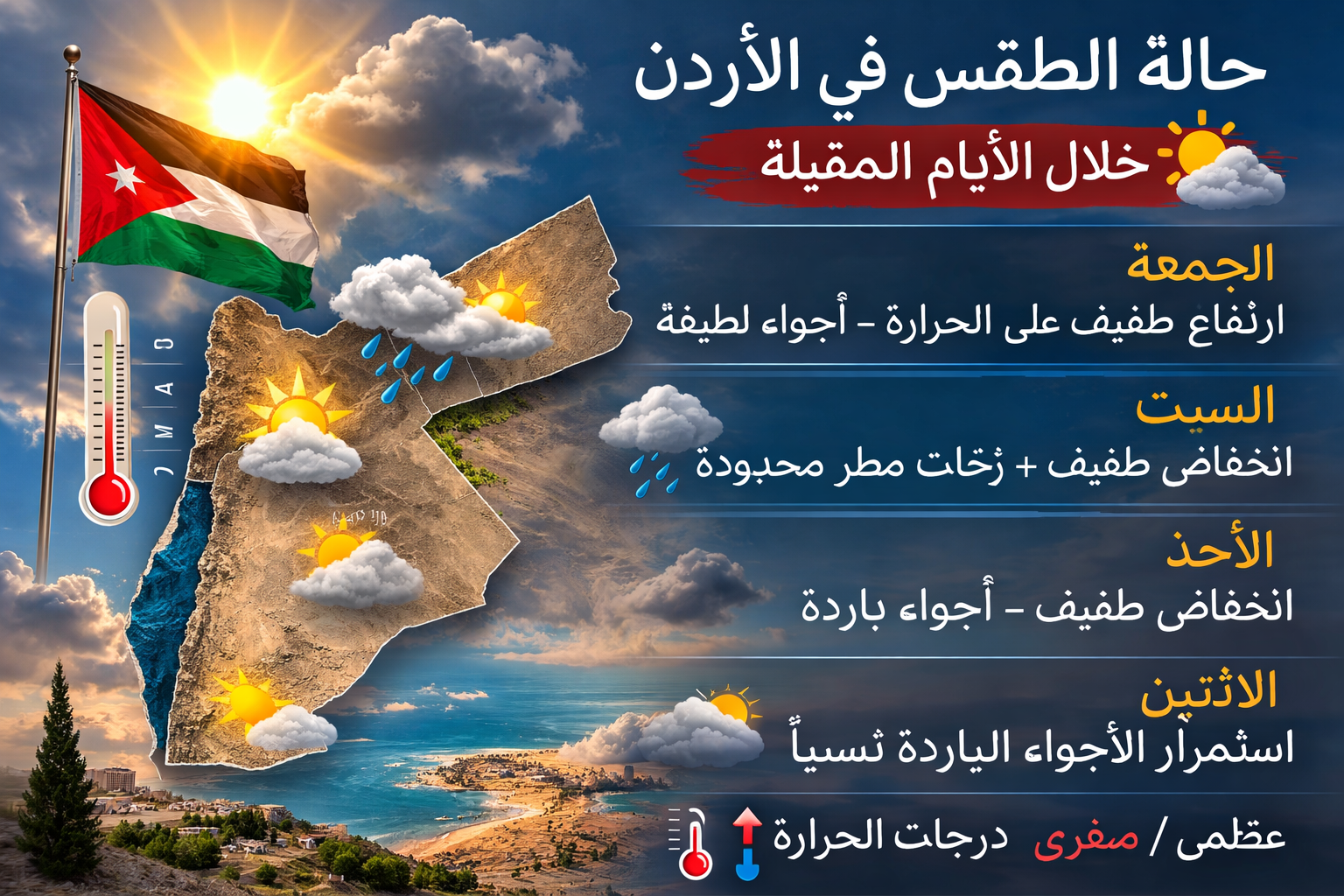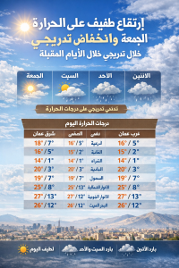المرفأ- توقعت دائرة الأرصاد الجوية أن تشهد المملكة يوم الجمعة ارتفاعاً طفيفاً على درجات الحرارة، لتصبح الأجواء لطيفة في معظم المناطق، ودافئة نسبياً في الأغوار والبحر الميت ووادي عربة. كما ستظهر بعض الغيوم على ارتفاعات عالية، مع رياح جنوبية شرقية خفيفة إلى معتدلة السرعة.
