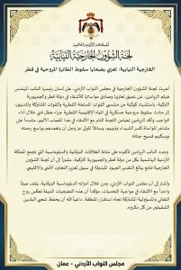 المرفأ- أعربت لجنة الشؤون الخارجية في مجلس النواب الأردني، على لسان رئيسها النائب المهندس هيثم الزيادين، عن عميق تعازيها وصادق مواساتها للأشقاء في دولة قطر والجمهورية التركية، باستشهاد كوكبة من منتسبي القوات المسلحة القطرية والقوات المشتركة والمدنيين، إثر حادث سقوط مروحية عسكرية في المياه الإقليمية القطرية جراء عطل فني خلال أداء الواجب. وأكد الزيادين تضامن اللجنة التام مع الأشقاء في هذا المصاب الأليم، مشدداً على مشاعر المواساة لأسر الشهداء وذويهم، وسائلاً المولى عز وجل أن يتغمدهم بواسع رحمته ويسكنهم فسيح جناته.