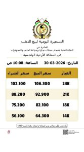 وبحسب التسعيرة، بلغ سعر بيع غرام الذهب من عيار 21، وهو الأكثر طلباً في السوق المحلية، 92.90 ديناراً، مقابل 88.20 ديناراً لجهة الشراء من محلات الصاغة.