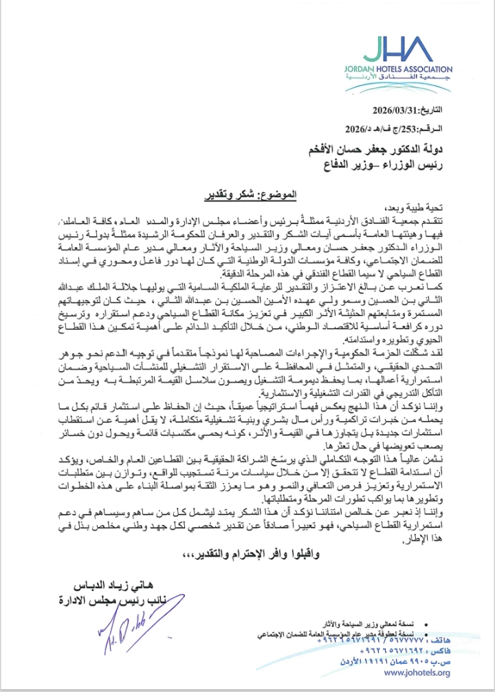 المرفأ- أصدرت جمعية الفنادق الأردنية كتاب شكر وتقدير وعرفان إلى الحكومة الأردنية، تقديراً للجهود المتميزة التي بذلتها في دعم القطاع السياحي، لا سيما القطاع الفندقي، من خلال الحزمة الحكومية الأخيرة التي ركزت على تعزيز الاستقرار التشغيلي وضمان استمرارية المنشآت السياحية في مواجهة التحديات الراهنة.