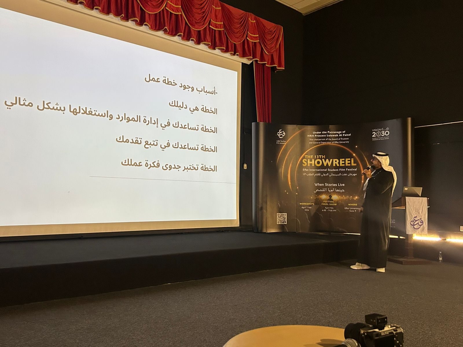 قدّم المدير التنفيذي لجمعية السينما هاني الملا ورشة بعنوان «الإدارة الثقافية: الريادة والاستدامة في المشاريع الثقافية – خطة العمل»، وذلك ضمن فعاليات مهرجان عفت السينمائي الدولي لأفلام الطلاب «شوريل» (Showreel) في دورته الثالثة عشرة، الذي تنظمه جامعة عفت.
