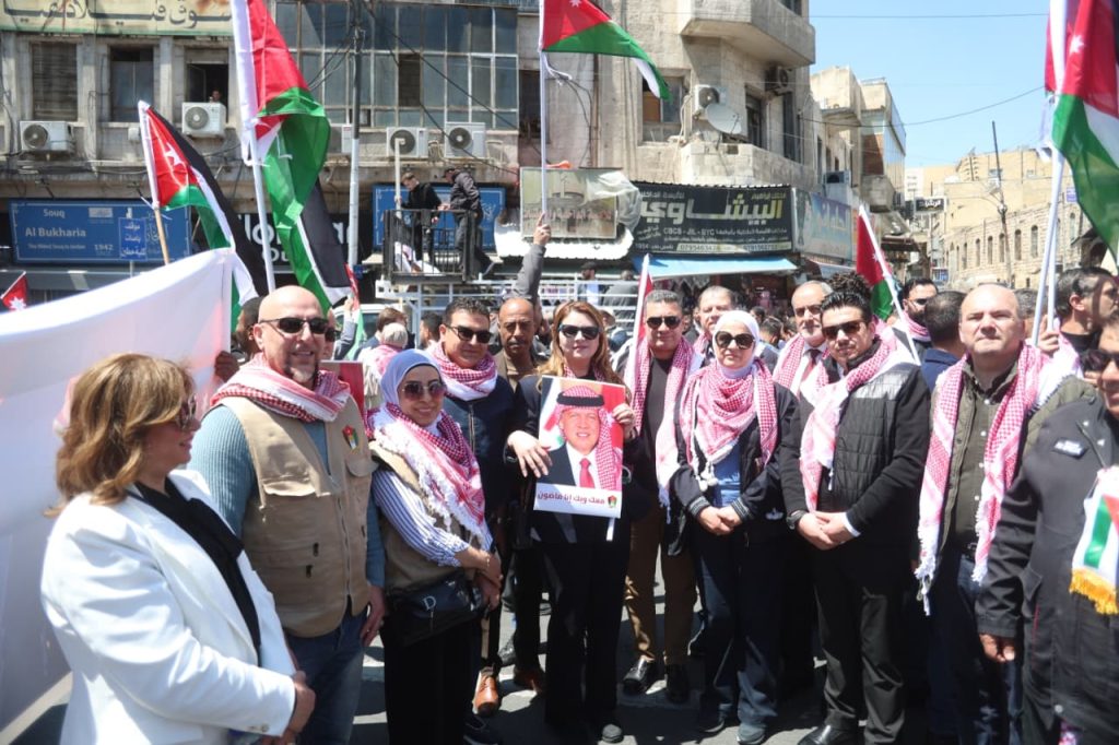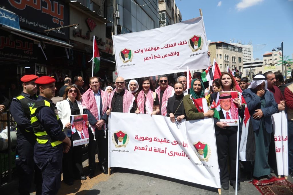 وجاءت مشاركة الحزب في هذه المسيرة، التي رُفعت فيها شعارات “لا لإغلاق الأقصى، لا لإعدام الأسرى”، تعبيرًا عن الالتفاف الشعبي والحزبي حول القيادة الهاشمية، وتأكيدًا على أن قضية القدس والمسجد الأقصى المبارك تمثل أولوية وطنية وقومية ثابتة لا تقبل المساومة.