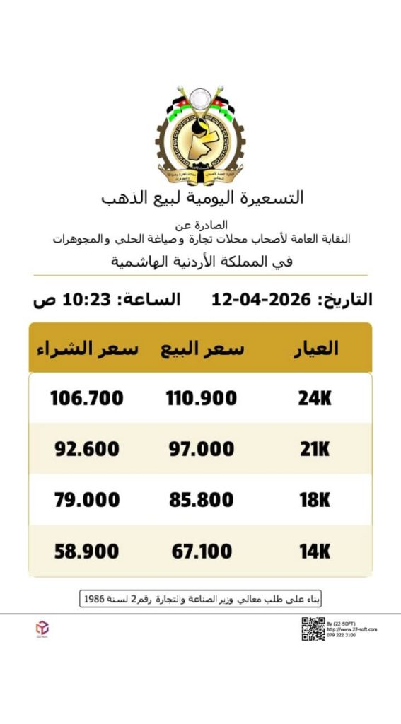 كما بيّنت التسعيرة الصادرة أن أسعار بيع الغرام الواحد من الذهب لعيارات 24 و18 و14 بلغت 110.9 ديناراً و85.8 ديناراً و67.1 ديناراً على التوالي، وسط استقرار نسبي في حركة الأسعار بالسوق المحلية.