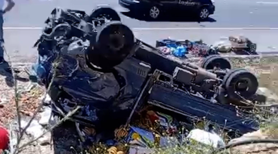وأظهر مقطع فيديو متداول المركبة مقلوبة رأساً على عقب، وسط كميات كبيرة من الخضار والفواكه المتناثرة، والتي تعرض جزء كبير منها للتلف.