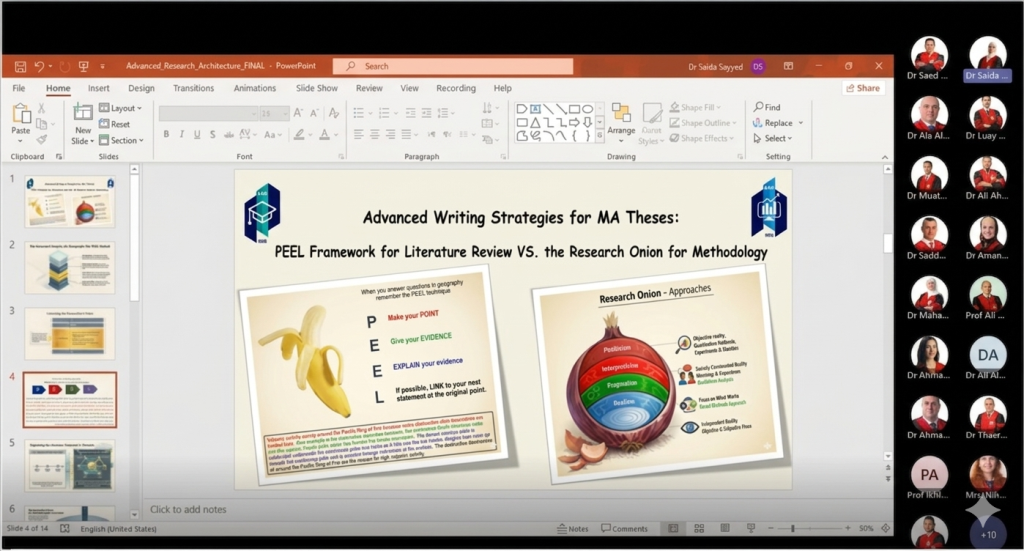 المرفأ- في إطار السعي المستمر لتطوير المهارات البحثية لدى طلبة الدراسات العليا، وبهدف تعزيز الممارسات الإشرافية في توعية الطلبة وتوجيههم نحو إتقان مهارات الكتابة الأكاديمية الرصينة وإعداد أطروحات علمية تتسم بالعمق المنهجي، نظمت كليتا الدراسات العليا والأعمال ورشة عمل علمية متخصصة بعنوان “استراتيجيات الكتابة المتقدمة في كتابة الرسائل الجامعية: إطار PEEL للأدبيات السابقة وبصلة البحث لمنهجية البحث العلمي”.